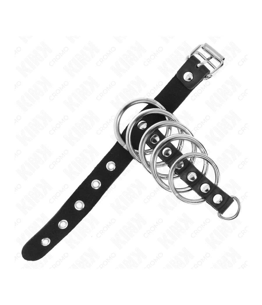 KINK - ANNEAU PÉNIS EN CUIR AVEC SANGLE DE VERROUILLAGE 21 X 2 CM ET 5 ANNEAUX MÉTALLIQUES DE 3 CM À 4 CM