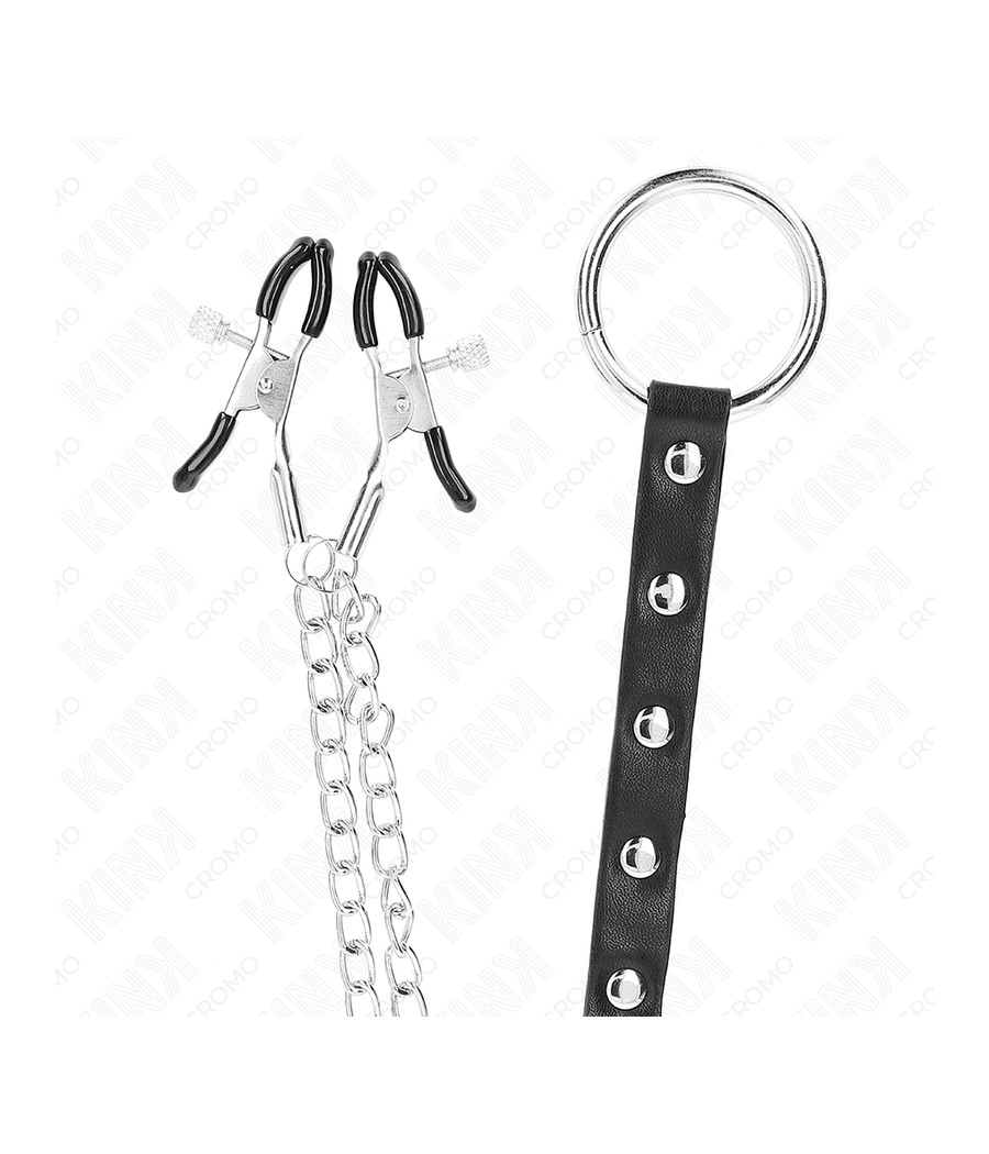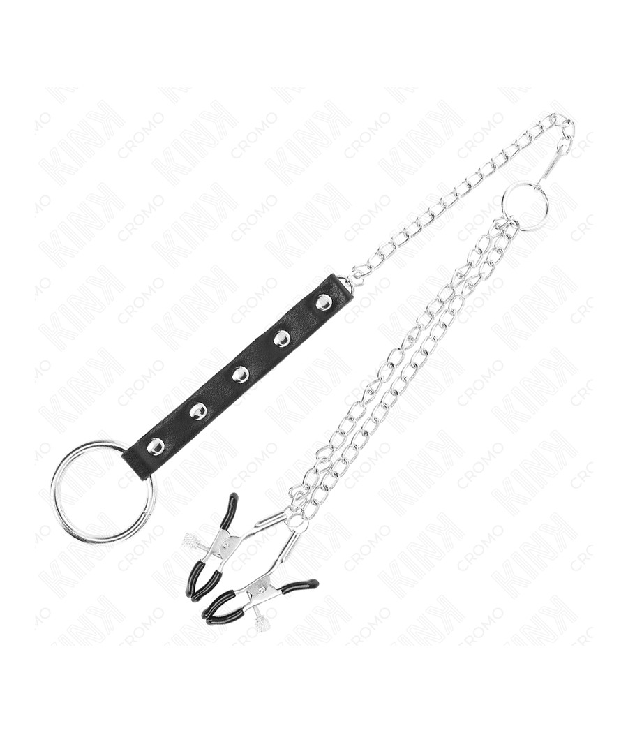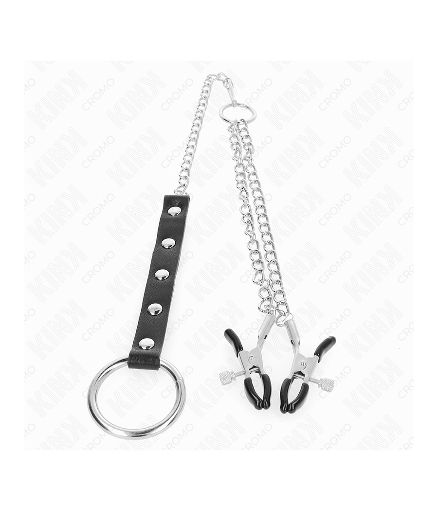 KINK - ANNEAU PÉNIS EN MÉTAL AVEC CHAÎNE ET PINCES À MAMELON RÉGLABLES