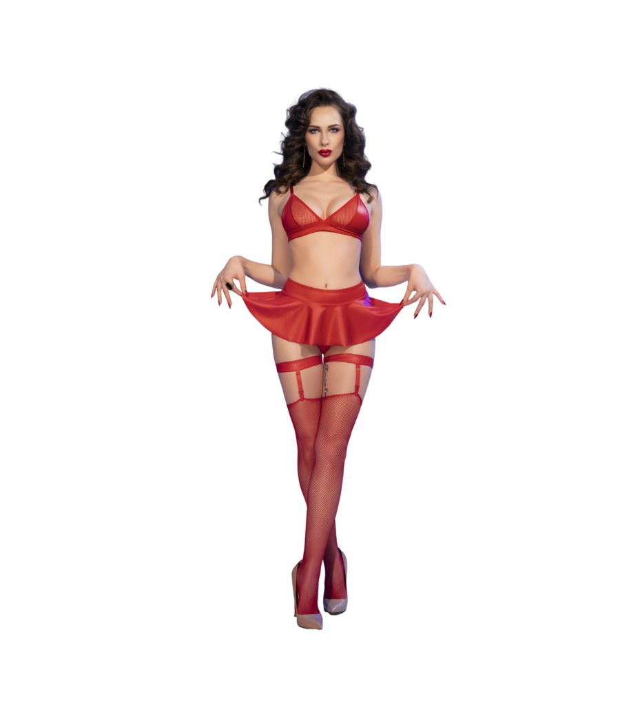 L39ensemble est complété par une jupe courte et évasée qui accentue la taille et ajoute une touche ludique. Il comprend également une culotte string, des porte-jarretelles et des bas assortis, créant un look entièrement sensuel et séduisant. Idéal pour les occasions spéciales qui nécessitent une tenue audacieuse et captivante.