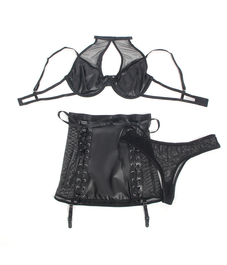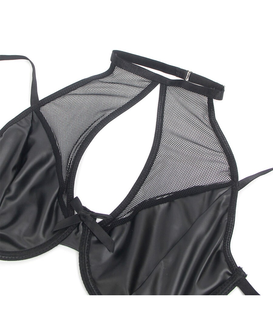 Cet ensemble de lingerie en cuir PU et maille translucide crée un équilibre parfait entre provocation et élégance. Le design licou met en valeur les épaules et le décolleté de manière saisissante, tandis que la matière vinyle lui donne une touche de rébellion et de puissance. Les détails en maille ajoutent des détails transparents stratégiques qui laissent entrevoir la peau de manière séduisante, alliant audace et sophistication.