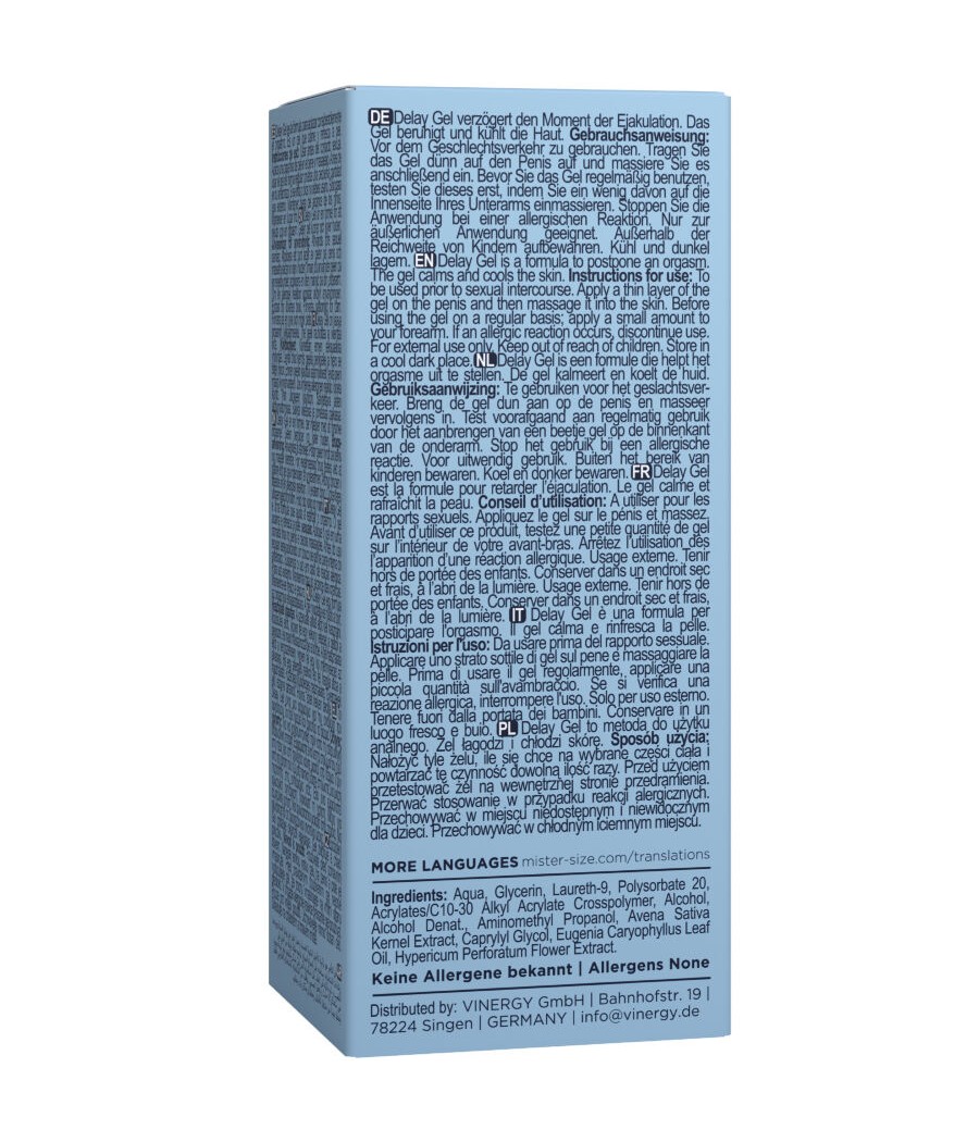 Contrairement à d'autres produits, Mister Size Delay Gel agit rapidement et de manière fiable : en seulement 5 à 10 minutes après l'application, vous commencerez à remarquer ses effets, vous permettant de profiter d'un meilleur contrôle et de plus de temps pour vivre intensément chaque instant.